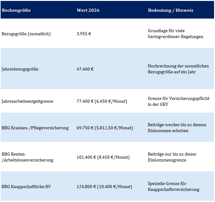 - Bezugsgröße: Anstieg von 3.745 € (2025) auf 3.955 € (2026) → +5,61 %.